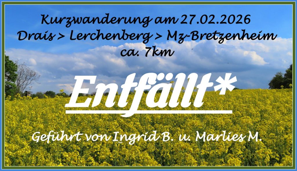 Veröffentlicht am 13/02/202624/02/2026kw20260227 *Die Kurzwanderung muss leider wegen des ÖPNV Steiks entfallen. „kw20260227“ weiterlesen Post Views: 128